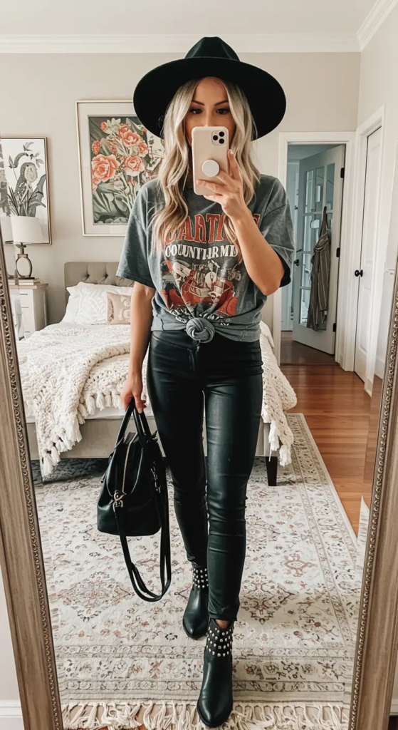 When I want something edgier, I go for a leather mini skirt with a vintage band tee. It creates a mix of rock and country energy. Black boots and a wide-brim hat make the look stand out.